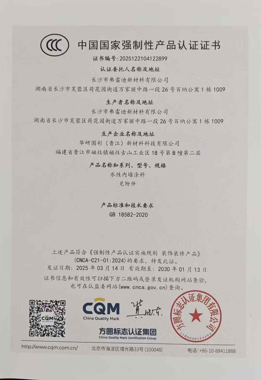 2024年国家市场监管总局制定发布《关于对商用燃气燃烧器具等产品实施强制性产品认证管理的公告》,决定对具有较高安全风险的7种产品实施CCC认证,其中包括水性内墙涂料。公告明确自2025年7月1日起,水性内墙涂料必须通过CCC认证并标注CCC认证标志后,方可出厂、销售、进口或者在其他经营活动中使用。